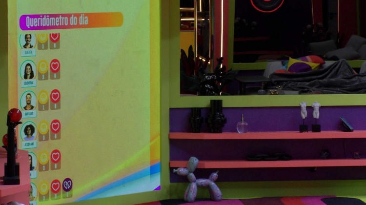 Eslovênia e Eliezer observam o Queridômetro do dia no telão da casa do BBB 22. "O meu está igual", comenta Eslovênia, que fala para o brother: "O teu aumentou uma [carinha]. Aumentou uma carinha, não foi?". "Aumentou uma", responde ele.