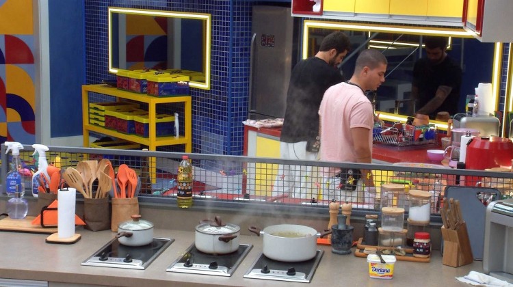 Arthur Aguiar segue para a cozinha da casa enquanto aguarda pelo Almoço do Líder. Vendo Pedro Scooby mexer nas panelas, o ator elogia o almoço preparado pelo surfista.
