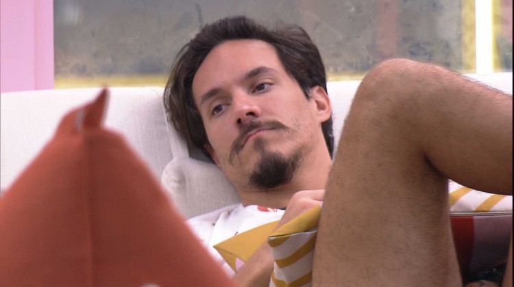 Pedro Scooby sai pela porta e senta no sofá ao lado dos brothers. Os dois param de falar.