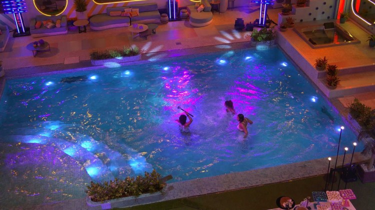 Linn da Quebrada, Jessilane e Natália pulam na piscina durante a Festa do Líder no BBB 22