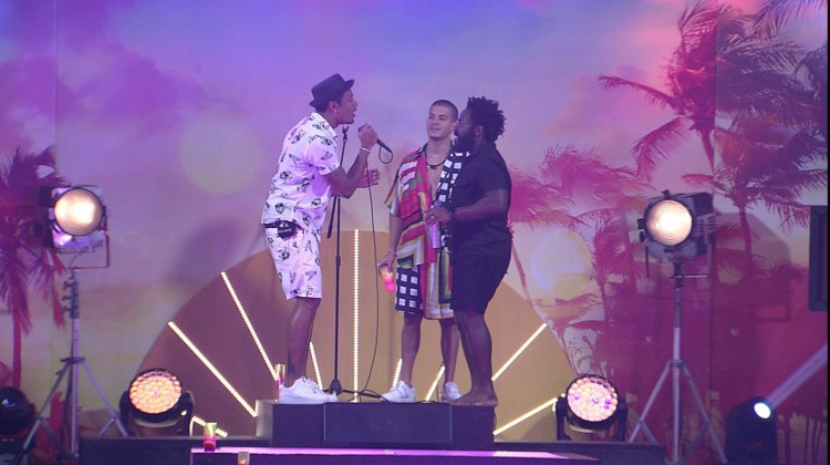 Douglas Silva e Arthur Aguiar se juntam a Paulo André no palco e cantam: "Blue agora é cor do amor."